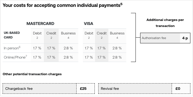 The rates above are indicative rates for “Miscellaneous and Speciality Retail” businesses with an annual card turnover between £25K-£2.5M (ATV of £25). They are taken from Global Payment’s merchant quotation tool required by the Payments Systems Regulator (PSR) and are accurate as of September 2025. As with nearly all providers, the higher the card turnover, the lower the rates.